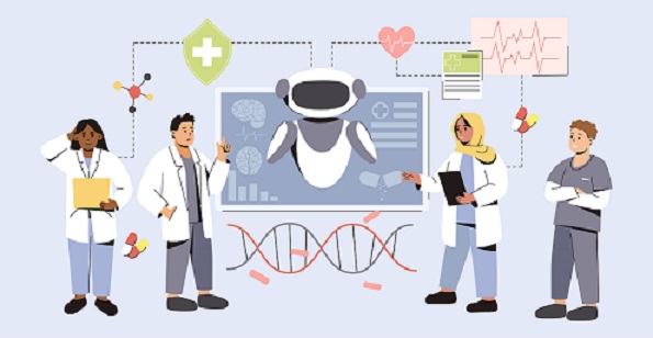 AI in medicine. Artificial Intelligence help in medical diagnosis and treatment of patients. Futuristic tech in medicine. Flat doctors using innovative technologies for research and disease analysis.